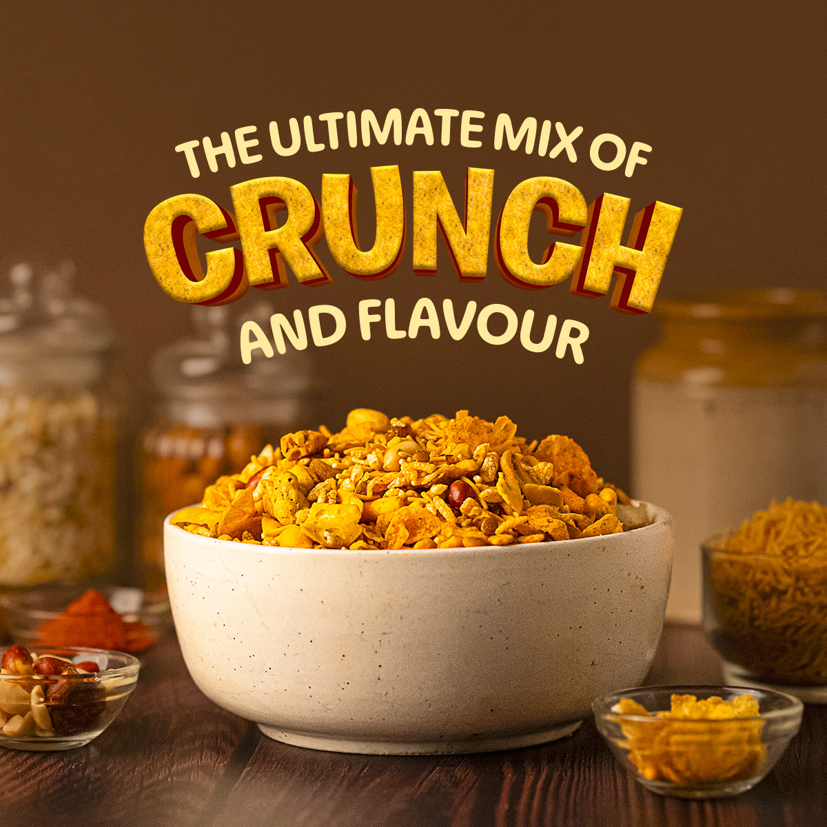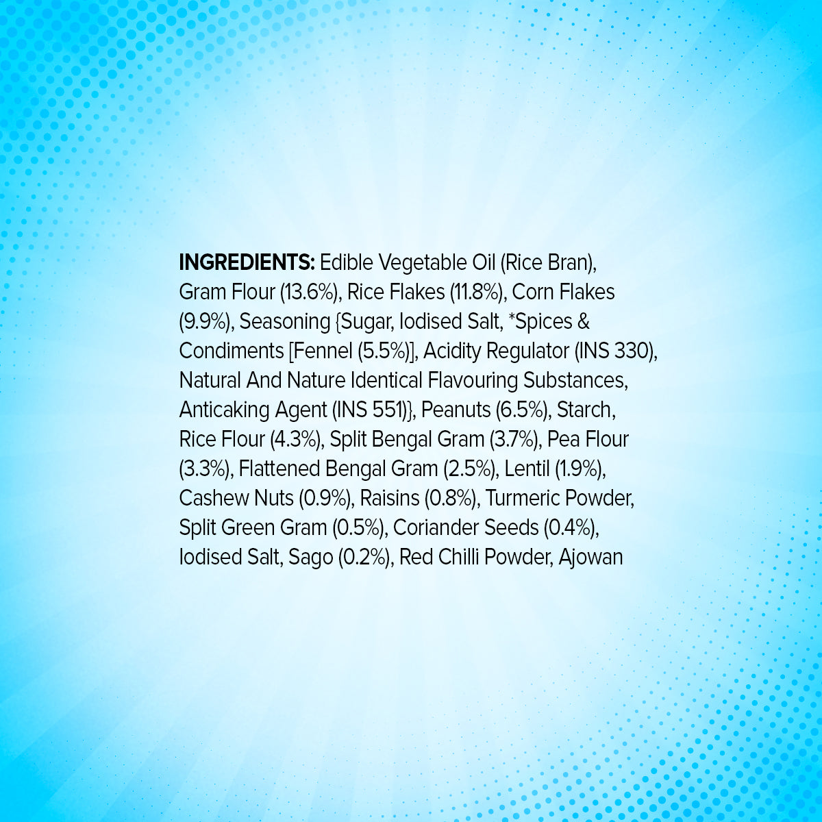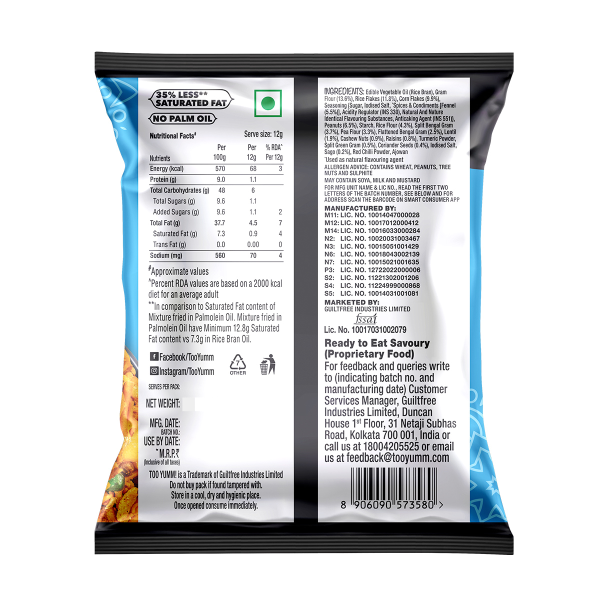 Too Yumm! All in One is a flavour-packed mixture of crunchy sev, flakes, nuts, and more — delivering sweet, tangy, and spicy notes in every bite. Made with 35% less saturated fat, zero palm oil, and 100% rice bran oil for a guilt-free munching experience.