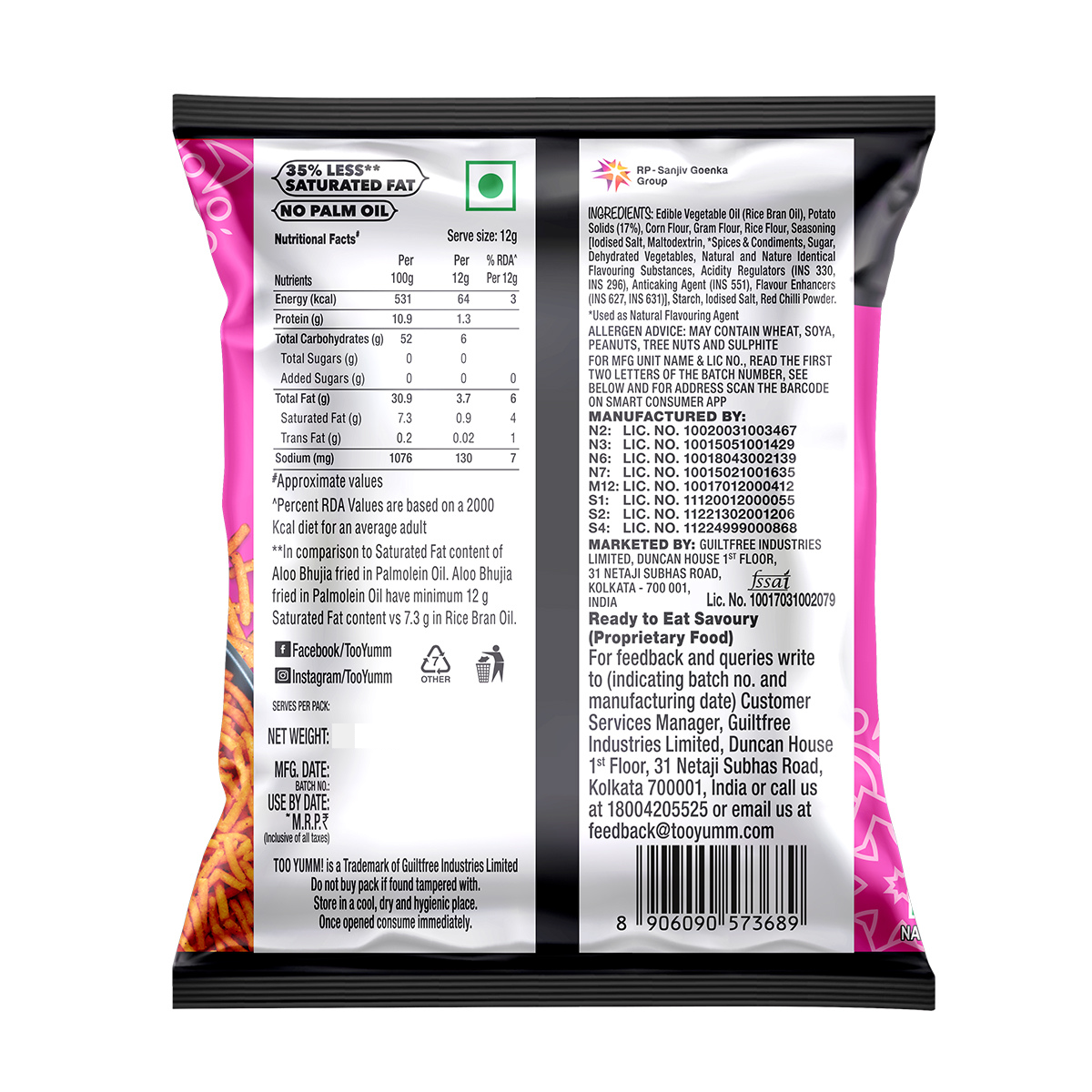 Too Yumm! Aloo Bhujia brings together the goodness of potatoes with a masaledaar punch. Light, crunchy, and made guilt-free with 35% less saturated fat, no palm oil, and 100% rice bran oil. The ultimate snack for desi flavour lovers.