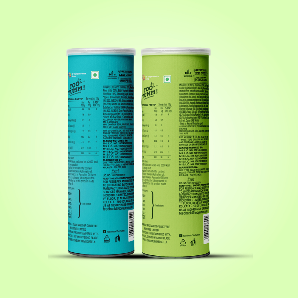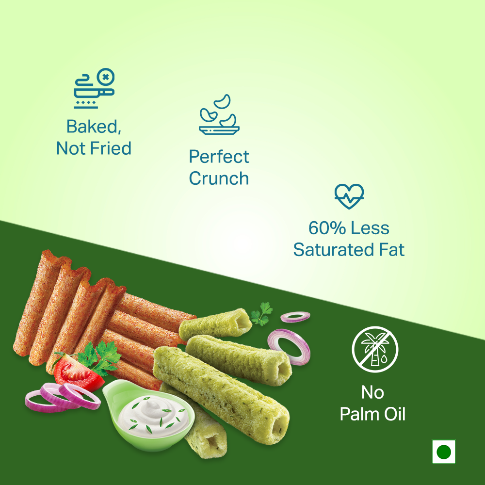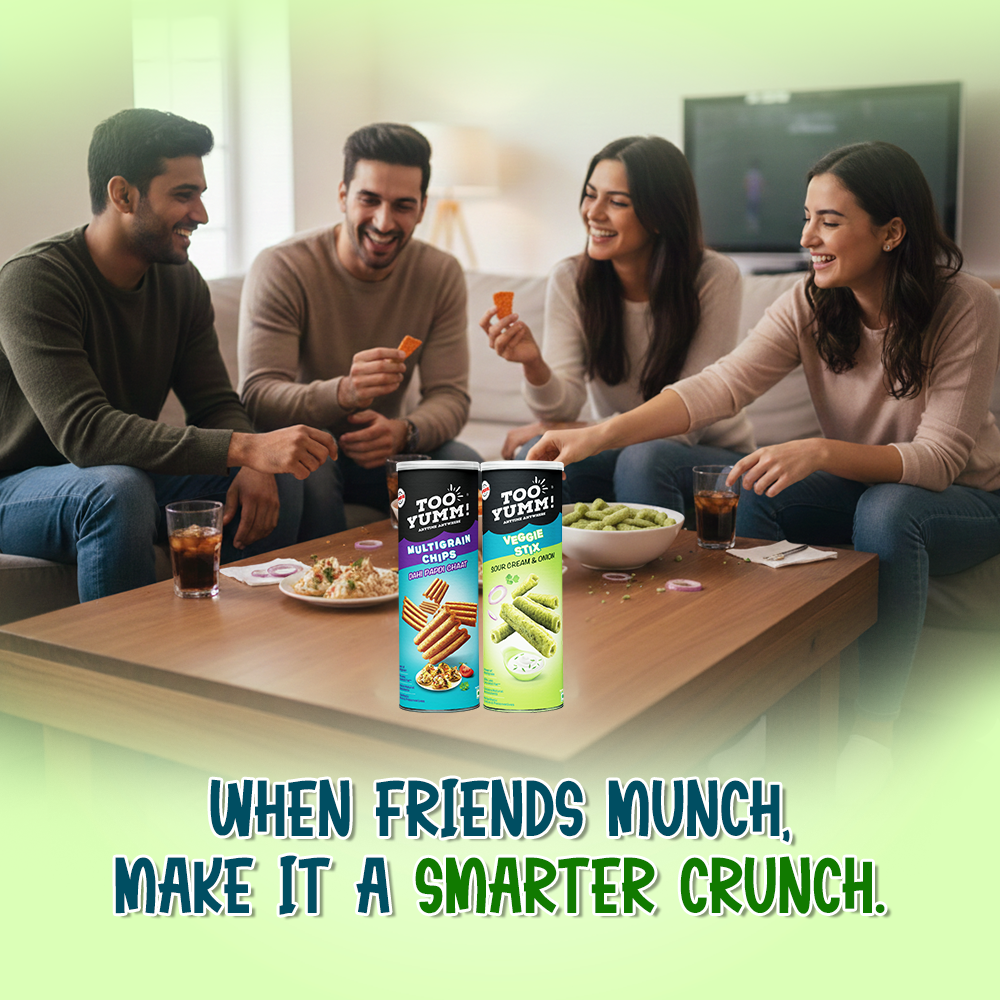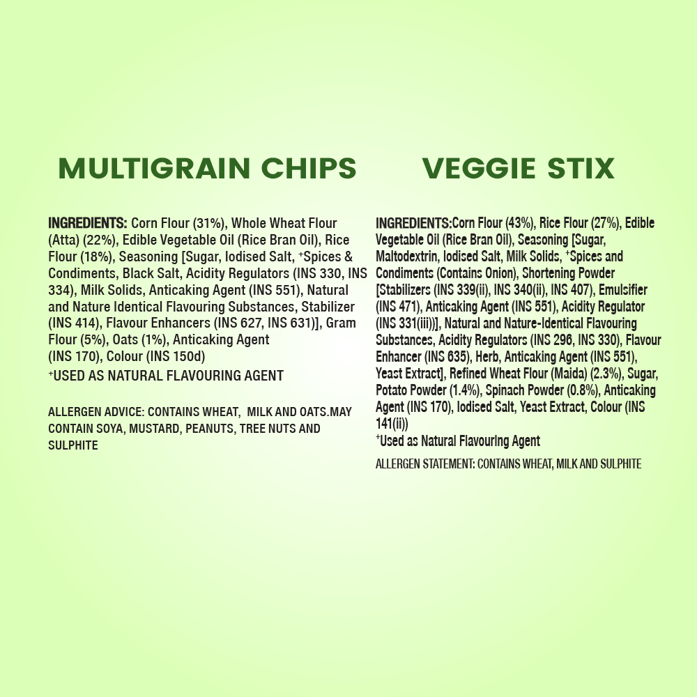 A chatpata twist to healthy snacking! Too Yumm! Multigrain Chips blend the tang of dahi papdi chaat with the Power of 5 Grains: Wheat, Rice, Corn, Gram, and Oats. Made with 60% less saturated fat, no palm oil & 100% rice bran oil.