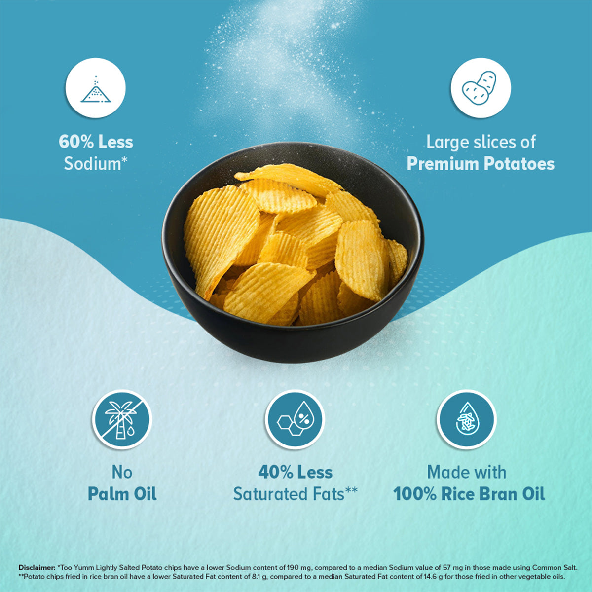 Too Yumm! Lightly Salted Chips offer a guilt-free crunch with 60% less sodium than leading brands. These premium chips are crafted from carefully graded, large slices of premium potatoes, delivering a bold, satisfyingly crunchy snack experience.