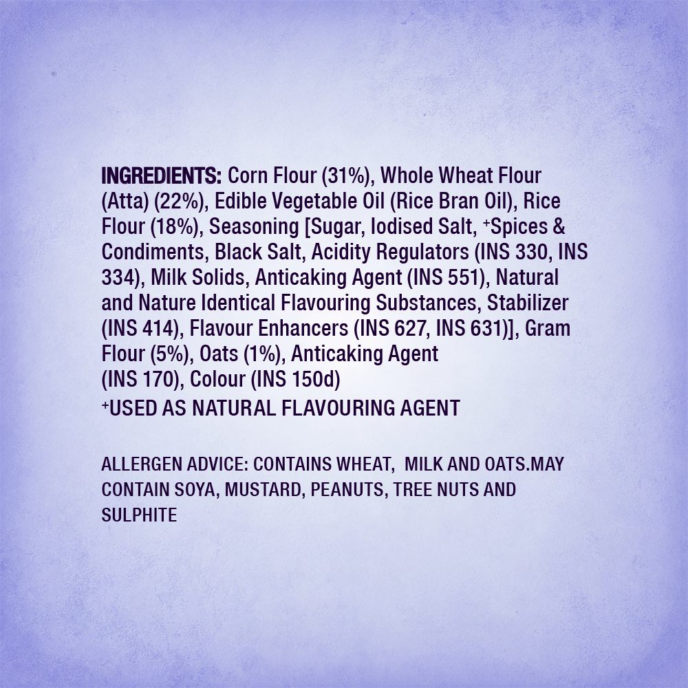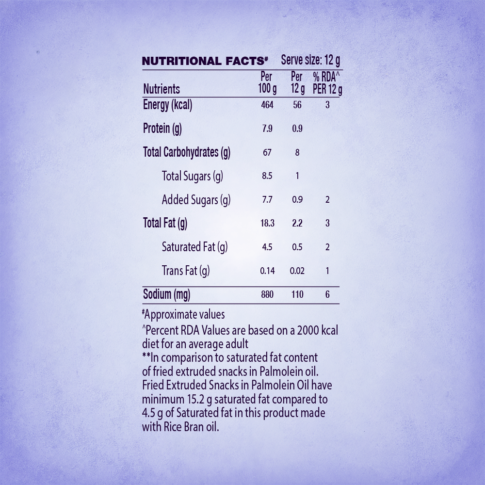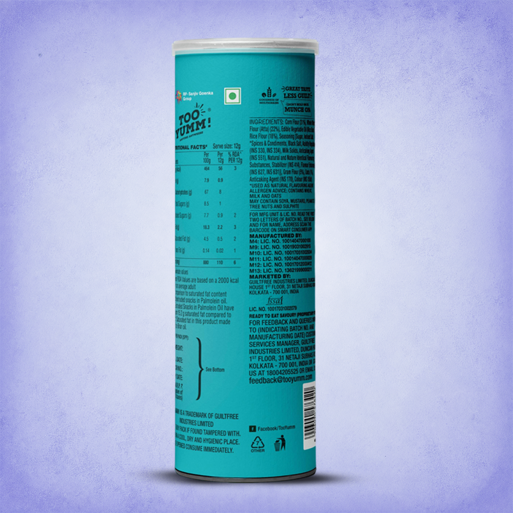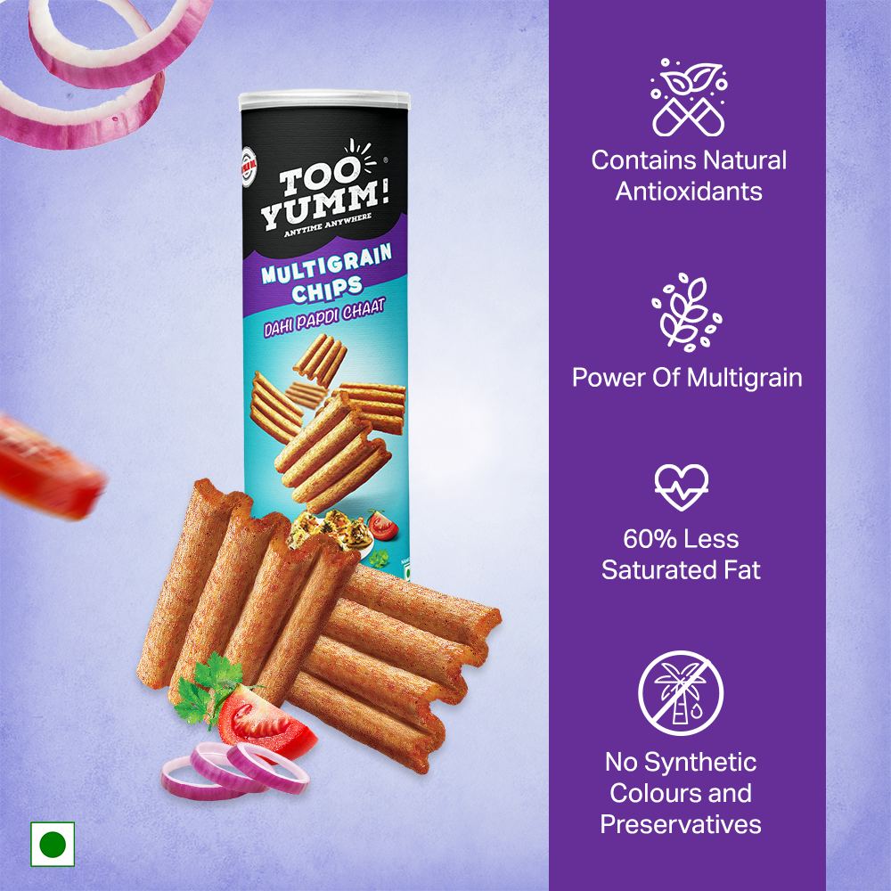 A chatpata twist to healthy snacking! Too Yumm! Multigrain Chips blend the tang of dahi papdi chaat with the Power of 5 Grains: Wheat, Rice, Corn, Gram, and Oats. Made with 60% less saturated fat, no palm oil & 100% rice bran oil.
