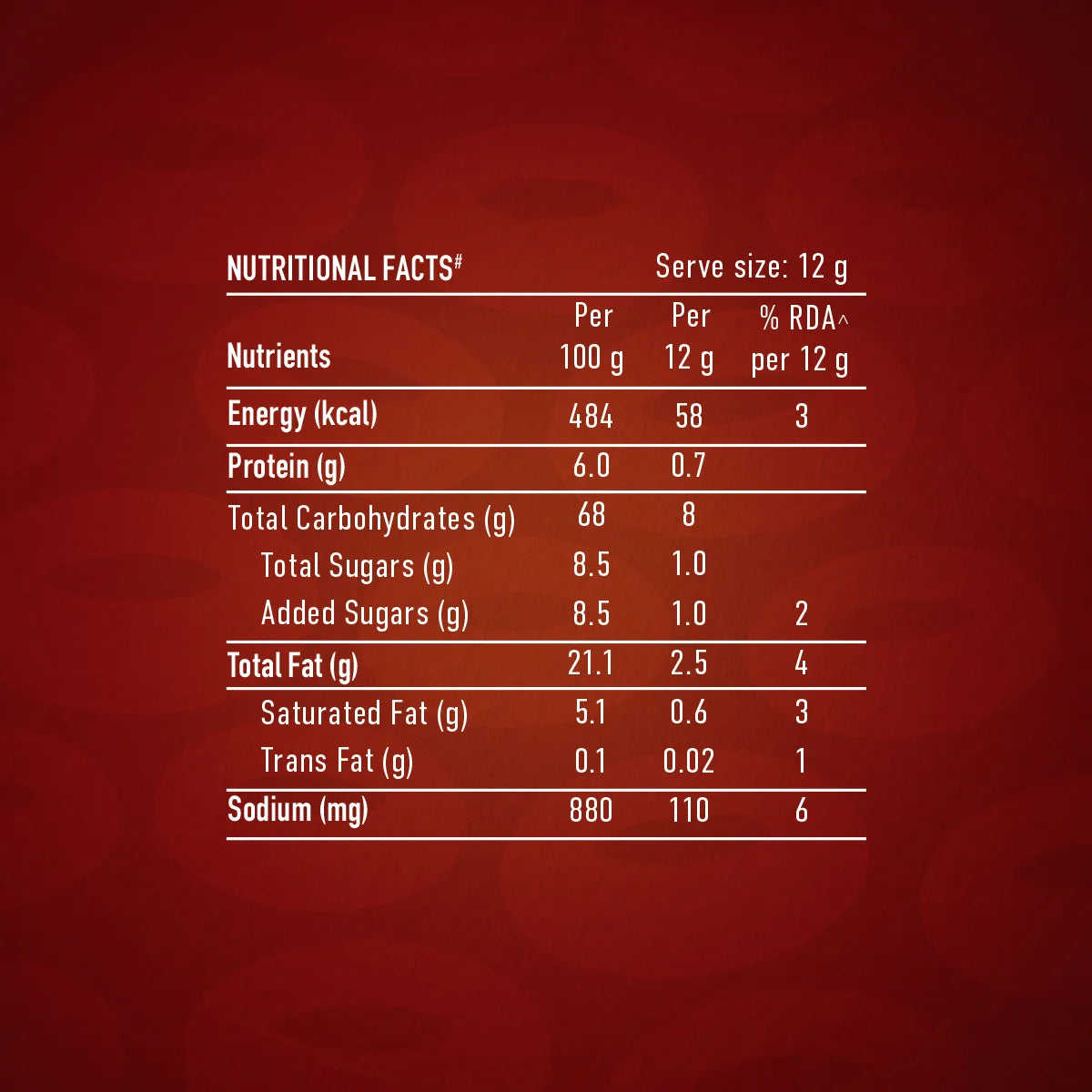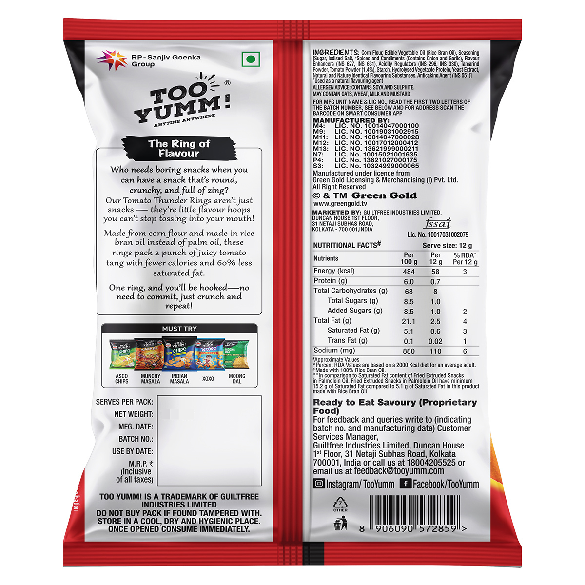 Who needs boring snacks when you can have a snack that's round, crunchy, and full of zing? Our Tomato Thunder Rings aren't just snacks - they're little flavour hoops you can't stop tossing into your mouth! Made from corn flour and made in rice bran oil instead of palm oil, these rings pack a punch of juicy tomato tang with fewer calories and 60% less saturated fat. One ring, and you'll be hooked - no need to commit, just crunch and repeat!