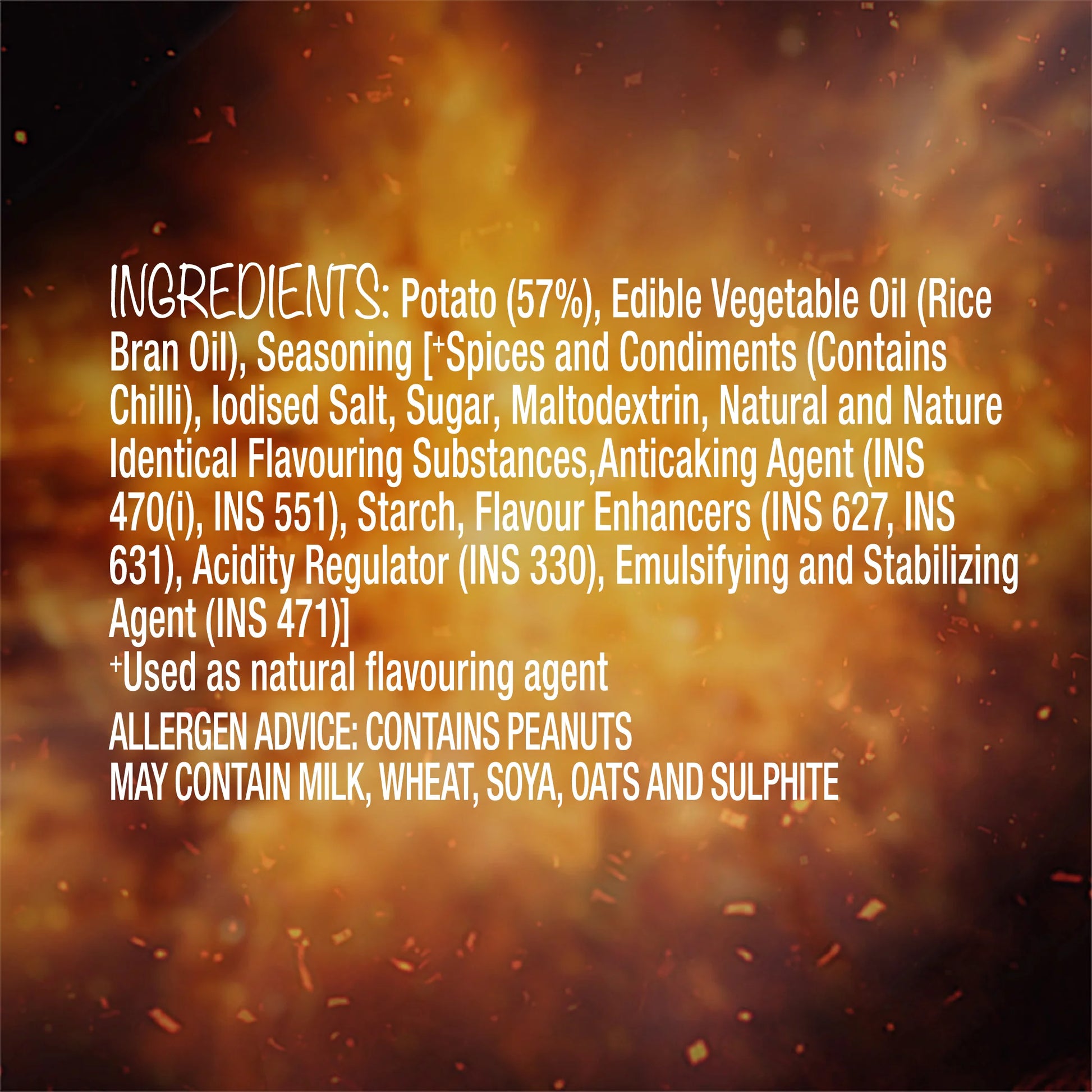 Set your taste buds on fire with Bhoot Chips! Featuring the fiery Bhut Jolokia flavour, these spicy potato chips are 100% veg, zero palm oil, & made with 100% rice bran oil. With 35% less saturated fat, it's a fiery crunch you can feel good about.